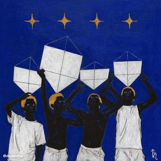 Emerson nasceu em São Paulo e o trabalho dele é focado na exaltação das vivências, experiências e estética do povo preto no Brasil. recomendo muitíssimo que sigam o perfil dele no instagram, o @de.saturno, e que olhem com atenção as criações e as legendas. ele compartilha fontes ricas de inspiração e escreve muito bem, é uma experiência completa.
