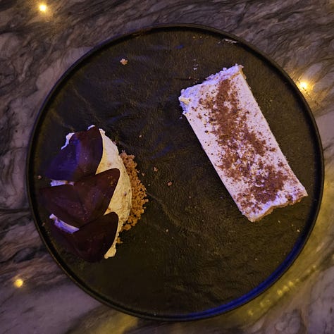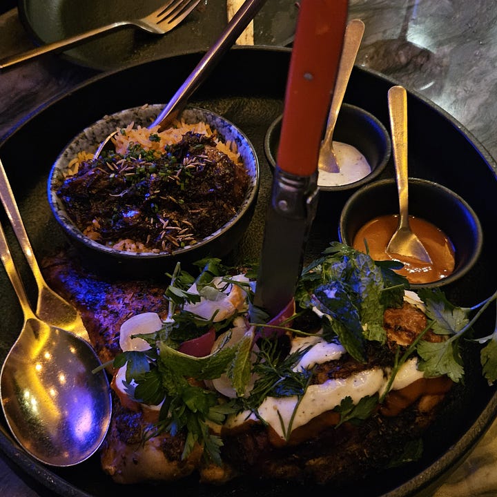 destaco, entre os pratos principais, o pastrami de wagyu com pão de coco e repolho derretido (na galeria acima, está no canto inferior esquerdo) e o frango com arroz e ervilha, cebola confitada e geleia de pimenta (ao lado). entre os doces, todos. são impecáveis! o ambiente arremata a experiência, com iluminação bem baixa, aconchegante e calorosa. o atendimento segue a mesma linha, perfeito.